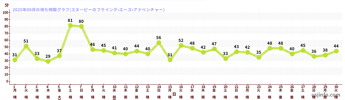 • スヌーピーのフライング•エース•アドベンチャー$B$N(B2025年09月01日のの一日平均待ち時間