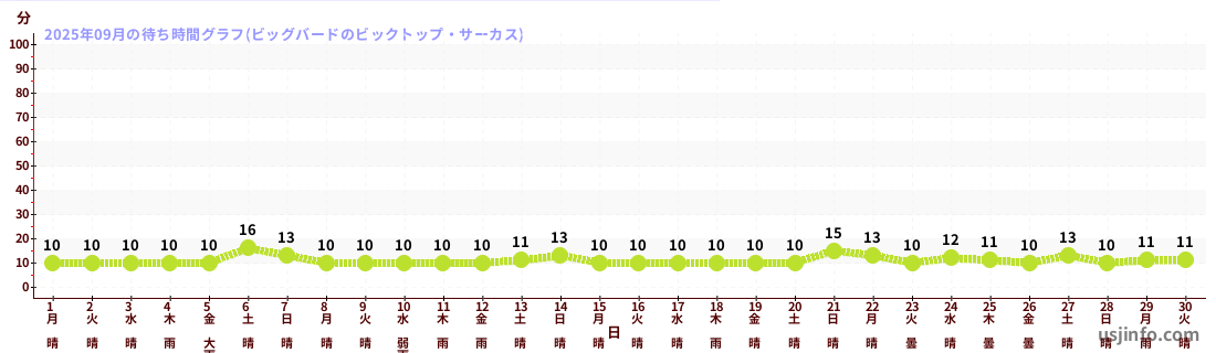 • ビッグバードのビックトップ・サーカス$B$N(B2025年09月01日のの一日平均待ち時間