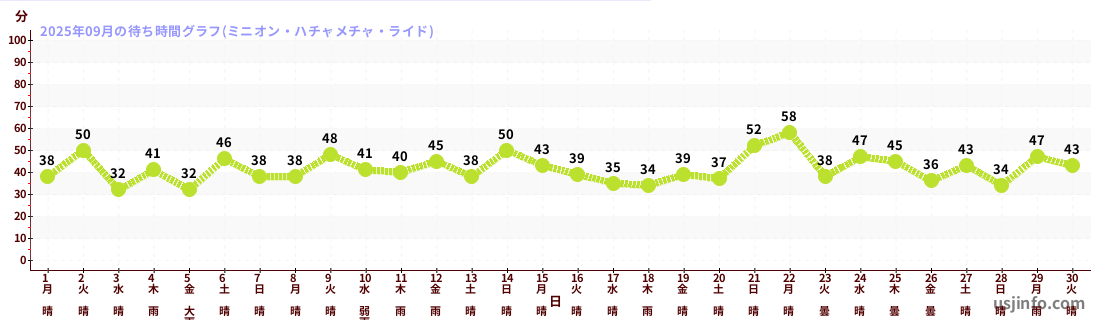 • ミニオン・ハチャメチャ・ライド$B$N(B2025年09月01日のの一日平均待ち時間