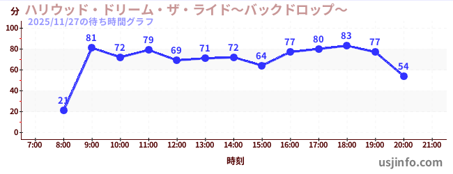 • ハリウッド・ドリーム・ザ・ライド〜バックドロップ〜$B$N(B2025年11月27日の待ち時間