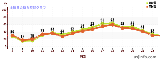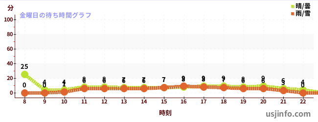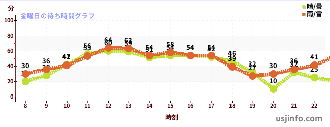• シュレック 4-D アドベンチャー™$B$N(B金曜日の平均待ち時間